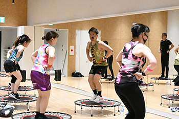 | 内容 | UBOUNDは、ミニトランポリンの弾力面を使用するハイインテンシティ(高強度)かつミニマムインパクト(膝・足首等への負担の少ない)トレーニングプログラムです。1回のクラスでおおよそ400~900kcalを消費することができます。独自のラディカルミュージックとトランポリンの躍動でシンプル、かつテンポよく実施されますが、体幹筋群に効果的な刺激を与えることができます。 強度:★★★ |
