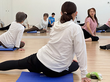 | 内容 | 産後の心身に寄り添い、骨盤や腹筋周りのケアや、肩こりや腰痛改善など、産後の身体の良好なリカバリーを目指します。全身を無理なくくまなく動かし、リフレッシュできるクラスです。親子で通えて、お互いの安心感と絆も育めます。 強度:★ |